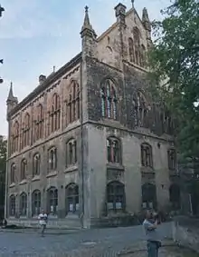 The remains of the monastery include the 13th century gothic church;[7] it is a cross-vaulted, colonnaded basilica with an extraordinarily long nave, a peculiar western façade, and a late Romanesque double-naved cloister. What remains of the original building (1137–40) is in the Romanesque style, while the restoration (1251–1268) belongs to the early Gothic.[2] Other buildings are now used as dormitories and lecture halls. There is also the Fürstenhaus ("prince's house"), built in 1573. Schulpforta was one of the three Fürstenschulen ("prince's schools") founded in 1543 by Maurice, Elector of Saxony (at that time Duke), the two others being at Grima and at Meissen.[7]