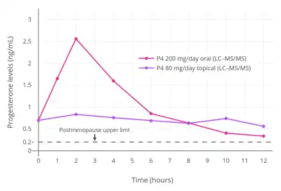 When oral progesterone is used at typical clinical dosages, only very low levels of progesterone are measured using reliable methods.[43][44][45] Following single doses of oral progesterone, peak levels of progesterone of 1.5 to 2.4 ng/mL with 100 mg and 2.8 to 4.7 ng/mL with 200 mg have been measured using LC–MS, liquid chromatography–tandem mass spectrometry (LC–MS/MS), and IA with adequate CS.[43][58][1] In one such study, although peak levels of progesterone were 2.2 ng/mL after a single 100 mg dose of oral progesterone, levels of progesterone remained significantly elevated for less than about 4 hours, and the average progesterone levels over a period of 24 hours were only 0.14 ng/mL.[45][1] For comparison, normal progesterone levels during the luteal phase of the menstrual cycle with LC–MS/MS are 6.7 to 22.2 ng/mL.[59] When IA alone has been used to measure progesterone levels with oral progesterone, far higher peak levels of 6.5 to 10.2 ng/mL, 13.8 to 19.9 ng/mL, and 32.3 to 49.8 ng/mL have been observed after single 100, 200, and 300 mg doses, respectively.[47][12] One IA-based study even reported maximal progesterone levels of 16 to 626 ng/mL (mean 247 ng/mL) with a single 300 mg dose of oral progesterone.[60][61]