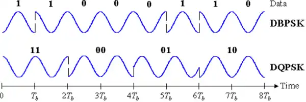 The modulated signal is shown below for both DBPSK and DQPSK as described above. In the figure, it is assumed that the signal starts with zero phase, and so there is a phase shift in both signals at .