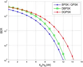 The bit-error rates of DBPSK and DQPSK are compared to their non-differential counterparts in the graph to the right. The loss for using DBPSK is small enough compared to the complexity reduction that it is often used in communications systems that would otherwise use BPSK. For DQPSK though, the loss in performance compared to ordinary QPSK is larger and the system designer must balance this against the reduction in complexity.