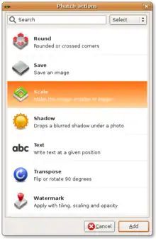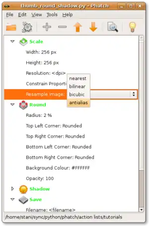 Typical actions include resizing, rotating, cropping, converting, applying shadows, rounded corners, perspective, reflection, and converting between different image formats.[2] Phatch can also be used to rename or copy image files based on the Exif or IPTC Information Interchange Model tags.