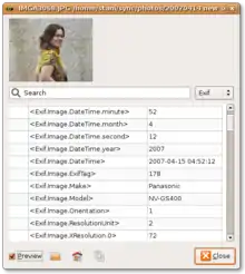 The image inspector can be used to explore the metadata tags stored in images. The tabs can be passed to any action, which is especially useful for renaming or copying files, but also for data-stamping such as date, time, aperture or shutter speed on the picture. Multiple inspectors can be opened at once to compare tag values with a preview of the image.