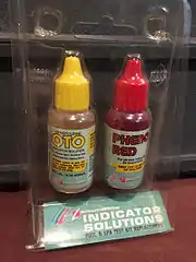 Phenol red, sometimes labelled with a different name, such as "Guardex Solution #2", is used as a pH indicator in home swimming pool test kits.[13]