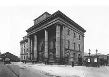 In 1825, he was appointed architect to the St Katherine's Dock Company, for whom he designed the dock buildings, Thomas Telford designing the docks themselves. In 1829 he became architect to the Goldsmiths' Company, designing a new hall for them which was opened in 1835.[1] In 1836, Hardwick became architect to the London and Birmingham Railway.[2] He built a great Doric propylaeum, which became known as the "Euston Arch", as an entrance to the railway's Euston Station. In 1838 he built the Curzon Street Station as the railway's Birmingham terminus. It is an austere cubic three-story building in the Ionic style, with a portico of four giant Ionic columns.[3]