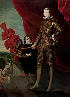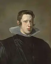 Philip IV was born in Royal Palace of Valladolid, and was the eldest son of Philip III and his wife, Margaret of Austria. In 1615, at the age of 10, Philip was married to 13-year-old Elisabeth of France. Although the relationship does not appear to have been close, some have suggested that Olivares, his key minister, later deliberately tried to keep the two apart to maintain his influence, encouraging Philip to take mistresses instead.[1] Philip had seven children by Elisabeth, with only one being a son, Balthasar Charles, who died at the age of sixteen in 1646. The death of his son deeply shocked the king, who appears to have been a good father by the standards of the day. Elisabeth was able to conspire with other Spanish nobles to remove Olivares from the court in 1643, and for a brief period she held considerable influence over Philip; by the time of her death, however, she was out of favour, following manoeuvering by Olivares' successor, Luis de Haro.[1]