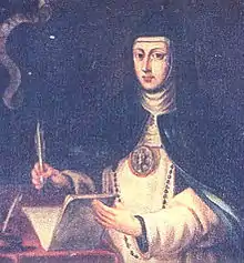 Although interpretations of Philip's role in government have improved in recent years, Diego Velázquez's contemporary description of Philip's key weakness – that 'he mistrusts himself, and defers to others too much' — remain relevant. Although Philip's Catholic beliefs no longer attract criticism from English language writers, Philip is still felt to have been 'unduly pious' in his personal life.[12] Notably, from the 1640s onwards he sought the advice and counsel of a noted cloistered abbess, Sor María de Ágreda, exchanging many letters with her.[14] This did not stop Philip for becoming known for his numerous affairs, particularly with actresses, as encouraged by the Count-Duke Olivares.[5] The most famous of these affairs was with the actress María Inés Calderón (La Calderona),[15] with whom he had a son in 1629, Juan José, who was brought up as a royal prince.[3] By the end of the reign, and with the health of Carlos José in doubt, there was a real possibility of Juan José's making a claim on the throne, which added to the instability of the regency years.
