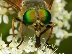 The adult females grow up to 18 millimetres (0.71 in) long. Their large compound eyes are bright green, without hairs and ocular bands. The terminal of antennae is brownish-black. The thorax is dark-brown and quite hairy. The abdomen has clearer bands at the end of each black tergite. Wings and legs are yellowish-brown. Halteres are brownish-yellow.[4][5]
