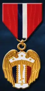 The Philippine Liberation Medal is a military award of the Republic of the Philippines which was created by an order of Commonwealth Army of the Philippines Headquarters on 20 December 1944, and was issued as the Philippine Liberation Ribbon. The decoration was presented to any service member, of both Philippine Commonwealth and allied militaries, who participated in the liberation of the Philippine Islands between the dates of 17 October 1944, and 2 September 1945. A full-sized medal was authorized and added on 22 July 1945.[1]