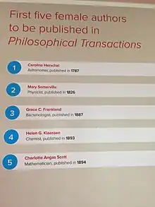 | Caroline Herschel | The first paper by a woman in the journal, An account of a new comet appeared in 1787.[18] Caroline Herschel was paid a salary of £50 per annum by the King to work with her brother William Herschel as an astronomer – unusual at a time when most who worked in astronomy or science did so without pay, regardless of gender |