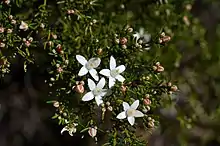 Philotheca ciliata is a shrub that grows to a height of about 2 m (6 ft 7 in). It has narrow elliptical to more or less cylindrical leaves 4–6 mm (0.16–0.24 in) long with more or less hairy edges. The flowers are borne singly or in twos or threes on the ends of the branchlets on a pedicel 1–2 mm (0.039–0.079 in) long. There are five broadly egg-shaped sepals about 1 mm (0.039 in) long and five narrow elliptical white petals about 5 mm (0.20 in) long. The ten stamens are joined in the lower part and hairy above. Flowering has been occurs from August to November and the fruit has tufts of hairs on the end.[2][3]