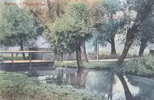 Phipps Bridge was built in the 1950s and 1960s on the previous site of a municipal refuse depot on Homewood Road and nearby streets of poor quality housing built in the late 19th century,[1] and was a reactivation of the pre-war slum clearance programme of the Municipal Borough of Mitcham (later called the London Borough of Merton).[2] It takes its name from a bridge over the nearby River Wandle, for which the first evidence documenting its existence was in the Valor Ecclesiasticus of 1535, which mentions a "Pypesbrige",[1] which in turn probably derives its name from an association with a local family called Pipp. The current bridge dates to the mid-1950s and replaced a Bailey bridge from the Second World War.[4]