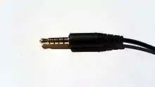 Four-conductor versions of the 3.5 mm plug and jack are used for certain applications. A four-conductor version is often used in compact camcorders and portable media players, providing stereo sound and composite analog video. It is also used for a combination of stereo audio, a microphone, and controlling media playback, calls, volume and/or a virtual assistant on some laptop computers and most mobile phones,[27] and some handheld amateur radio transceivers from Yaesu.[28] Some headphone amplifiers have used it to connect "balanced" stereo headphones, which require two conductors per audio channel as the channels do not share a common ground.[29]