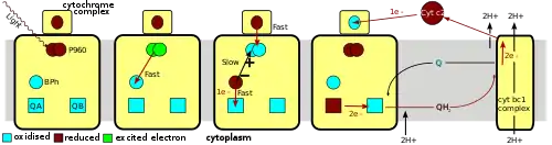 The high-energy electron that resides on the tightly bound quinone molecule QA is transferred to an exchangeable quinone molecule QB. This molecule is loosely associated with the protein and is fairly easy to detach. Two of the high-energy electrons are required to fully reduce QB to QH2, taking up two protons from the cytoplasm in the process. The reduced quinone QH2 diffuses through the membrane to another protein complex (cytochrome bc1-complex) where it is oxidized. In the process the reducing power of the QH2 is used to pump protons across the membrane to the periplasmic space. The electrons from the cytochrome bc1-complex are then transferred through a soluble cytochrome c intermediate, called cytochrome c2, in the periplasm to the cytochrome subunit.