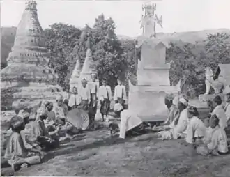 In Buddhism in Burma, the water ceremony (yay zet cha), which involves the ceremonial pouring of water from a glass into a vase, drop by drop, concludes most Buddhist ceremonies including donation celebrations and feasts. This ceremonial libation is done to share the accrued merit with all other living beings in all 31 planes of existence.[7] While the water is poured, a confession of faith, called the hsu taung imaya dhammanu, is recited and led by the monks.[8] Then, the merit is distributed by the donors, called ahmya wei, by saying Ahmya ahmya ahmya yu daw mu gya ba gon law three times, with the audience responding thadu, Pali for "well done." The earth goddess, known in Burmese as Wathondara (ဝသုန္ဒရာ) or Wathondare (ဝသုန္ဒရေ), is invoked to witness these meritorious deeds.[8] Afterward, the libated water is poured on soil outside, to return the water to the goddess.