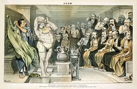 Bernhard Gillam made a famous caricature drawing in 1884 titled Phryne before the Chicago Tribunal, where Phryne is replaced by the Republican Party presidential candidate James G. Blaine, covered in scandals, and Hypereides by the newspaper editor Whitelaw Reid. Teddy Roosevelt can be seen in the front row.[3]
