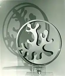 In the early 1970s Mark conceived the idea to execute her designs in miniature as jewelry, her Sculpture-to-wear. A major turning point of her career came in 1972, when the Museum of Modern Art commissioned an edition of 100 Sculpture-to-wear, individually numbered, 23-karat gold-plated aluminum, for sale in its gift shop. This edition, entitled Kinetic Circle, was followed by a second MoMA gift shop commission, Quadrille, again an edition of 100 in gold-plate.[7] In agreement with MoMA, the artist manufactured these same designs in aluminum, unplated, in numbered editions of 250, for sale elsewhere. These same years saw the artist initiate other Sculpture-to-wear designs, editions of 100/250, including Seahorse Oval, Aztec Memory, Arabesque, Enclosed Triangles, some ten designs in all. These were for sale at her one-woman exhibitions, and were on permanent display at a number of galleries, including Gimpel & Weitzenhoffer in Manhattan; Fontana Gallery, Narbeth, PA; Gallerie 99, Bay Harbor Islands, FL; Images Gallery, Toledo, OH; and Rubiner Gallery, Royal Oak, MI.[8]