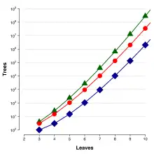 Among labeled bifurcating trees, the number of unrooted trees with leaves is equal to the number of rooted trees with leaves.[3]