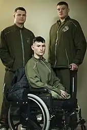 - Tracksuit: OD green with reflective piping, reflective Marines logo on the left chest and MARINES lettering in red with gold outline centered on the back of jacket, and same logo on the upper left thigh and vertical USMC lettering in the same design on the lower right leg of pants.