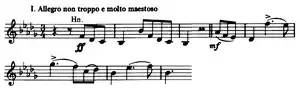 The first movement starts with a short horn theme in B♭ minor, accompanied by orchestral chords which quickly modulate to the lyrical and passionate theme in D♭ major. This subsidiary theme is heard three times, the last of which is preceded by a piano cadenza,[3] and never appears again throughout the movement. The introduction ends in a subdued manner. The exposition proper then begins in the concerto's tonic minor key, with a Ukrainian folk theme based on a melody that Tchaikovsky heard performed by blind lirnyks at a market in Kamianka (near Kyiv). A short transitional passage is a call and response section on the tutti and the piano, alternating between high and low registers. The second subject group consists of two alternating themes, the first of which features some of the melodic contours from the introduction. This is answered by a smoother and more consoling second theme, played by the strings and set in the subtonic key (A♭ major) over a pedal point, before a more turbulent reappearance of the woodwind theme, this time re-enforced by driving piano arpeggios, gradually builds to a stormy climax in C minor that ends in a perfect cadence on the piano. After a short pause, a closing section, based on a variation of the consoling theme, closes the exposition in A♭ major.[4]