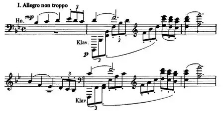 The work opens with the following horn call, which provides much of the thematic material for the first movement: