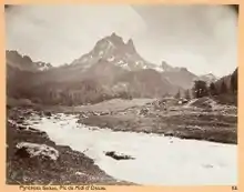 The Pic du Midi d'Ossau (2,884 m) is a mountain rising above the Ossau Valley in the French Pyrenees. Despite possessing neither a glacier nor, in the context of the range, a particularly high summit, its distinctive shape makes it a symbol of the French side of the Pyrenees. This familiar shape also makes it easily recognisable from afar, and it is particularly distinctive from the Boulevard des Pyrénées in Pau, some 55 km to the north.[1][2]
