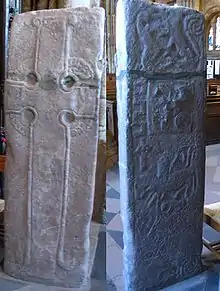 - Class II — stones of more or less rectangular shape with a large cross and symbol(s) on one or both sides. The symbols, as well as Christian motifs, are carved in relief and the cross with its surroundings is filled with designs. Class II stones date from the 8th and 9th century.