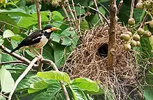 The breeding season in India is spread from March to September. With the onset of breeding, the sizes of flocks decline and birds pair up. Courtship involves calling, fluffing of the feathers and head bobbing. The nest is a loose mass of straw formed into a dome with an entrance on the side and placed in a large tree (often banyan, mango, jackfruit, rosewood[18]) or sometimes on man-made structures,[19] often close to human habitation. Several pairs will breed in the same vicinity. The usual clutch is made up of about four to six glossy blue eggs. Each egg is laid with a day in between and incubation begins only after the third or fourth egg is laid. The eggs hatch after 14 to 15 days. The young are brooded for two weeks, the female staying at the nest during the night. Both parents feed the chicks until they fledge and leave after three weeks. More than one brood may be raised in a season.[5][6][20]