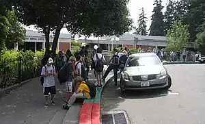 Although the school has closed lunch, much of the campus is open to the air. The campus sprawls from its street entrance to Witter Field at the back and Piedmont High School on the right.