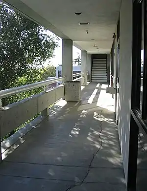 Much of the school is made of concrete with fake brick layers. Only a few buildings — such as the science and P.E. buildings — are completely indoors. The main building has open hallways. Most hallways and many classroom have views of the Bay.