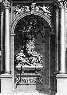 The chapel was meant to receive several family members, including the cardinal himself, but first and foremost his parents, Frédéric Maurice de La Tour d'Auvergne, Duc de Bouillon and Éléonor de Bergh, Duchesse de Bouillon. Depicted as the main characters in the centre of the monument their grouping and gestures allude to the fact that Éléonor was instrumental in converting her husband to catholicism. Another important component was the heart of the duke's brother, the national hero Turenne, enclosed in a heart shaped container of gilded silver and carried towards heaven by a youthful angel who rises from a heraldic tower of white marble which links the family name La Tour to the biblical tower of David. Together with some other sculptures outside the chapel (not planned to be made by Le Gros and, in fact, never executed), the iconographic message was the postulation of a royal rank and sovereignty of the family dating back to the 9th century, the same message Cardinal de Bouillon tried to support by commissioning a written history of his ancestry from the historiographer Étienne Baluze,[note 19] published in 1708 and containing an engraving of the envisaged funeral chapel with an idealised view of Le Gros's monument.