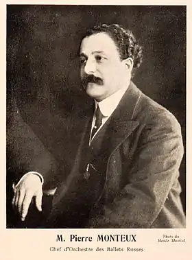 Pierre Benjamin Monteux (pronounced [pjɛʁ mɔ̃.tø]; 4 April 1875 – 1 July 1964)[n 1] was a French (later American) conductor. After violin and viola studies, and a decade as an orchestral player and occasional conductor, he began to receive regular conducting engagements in 1907. He came to prominence when, for Sergei Diaghilev's Ballets Russes company between 1911 and 1914, he conducted the world premieres of Stravinsky's The Rite of Spring and other prominent works including Petrushka, Ravel's Daphnis et Chloé, and Debussy's Jeux. Thereafter he directed orchestras around the world for more than half a century.