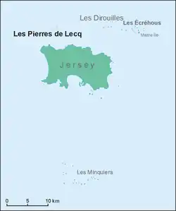 Les Pierres de Lecq (Jèrriais: Les Pièrres dé Lé) or the Paternosters are a group of uninhabitable rocks or a reef in the Bailiwick of Jersey between Jersey and Sark, 6 km (3.7 mi) north of Grève de Lecq in Saint Mary, and 22.4 km (13.9 mi) west of the Cotentin Peninsula in Normandy. Only three or four of the rocks remain visible at high tide: L'Êtaîthe (the eastern one), La Grôsse (the big one) and La Vouêtaîthe (the western one). The area has one of the greatest tidal ranges in the world, sometimes being as much as 12 m (40 ft).[1]