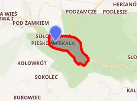 Pieskowa Skała (pronounced [pʲɛsˈkɔva ˈskawa]; Polish for Little Dog's Rock), is a limestone cliff in the valley of river Prądnik, Poland, best known for its Renaissance castle. It is located within the boundaries of the Ojców National Park, 27 km north of Kraków, close to the village of Sułoszowa. The castle was first mentioned in Latin documents of Polish king Władysław I the Elbow-high (Władysław Łokietek) before 1315, as "castrum Peskenstein".