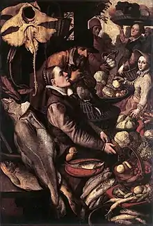 After beginning by painting religious works, in the 1550s he developed the painting of domestic scenes in which he reproduced articles of furniture, cooking utensils, and food with great flair and realism. His Butcher's Shop, with the Flight into Egypt (Uppsala, 1551) "has been called the earliest example of Mannerist inversion of still life in Northern painting", showing the "lower" subject matter far more prominently than the subject from history painting.[6] A similar inversion in landscape painting had been developed by Joachim Patinir in Antwerp several decades earlier when he invented the world landscape. Unlike these, in Aertsen's works the genre material dominates the front of the image, with the history scene, normally religious, easy to overlook in the background. This pictorial technique drew on the paintings of another Antwerp artist, Jan Sanders van Hemessen, whose genre treatments of religious and moral scenes had smaller scenes inset into the background in a similar way.[7]