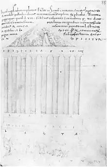 Second, Pietro commissioned an illustrated copy of the Notitia Dignitatum in 1436; it now resides as MS Canon. Misc. 378 in the Bodleian Library.[7] The manuscript of the Notitia which Pietro had copied was one he had found in Speyer, the Codex Spirensis earlier that year attending the council at Basel; its discovery influenced the Roma instaurata of Flavius Blondus.[8] The work of Frontinus on the aqueducts of Rome and Vitruvius's De architectura were preserved in very poor manuscripts until Giovanni Giocondo edited them in the 1430s, for presentation to Pietro.[9]