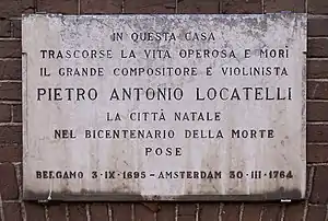 Locatelli began studying in Rome in autumn 1711, probably under Antonio Montanari or Giuseppe Valentini and perhaps for a short time under Arcangelo Corelli, who died in January 1713.[4] In a letter of 17 March 1714 Locatelli wrote to his father in Bergamo that he was a confirmed member of the compita accademia di vari instrumenti, the household musicians of Prince Michelangelo I Caetani (1685–1759), where Valentini had worked as a violinist and composer since no later than 1710.[5] Between 1716 and 1722, Locatelli was also a member of the congregazione generale dei musici di S. Cecilia, and thus under the protection of the noble prelate and future Cardinal Camillo Cybo.[6] He also assisted other Roman noble houses, often including that of Cardinal Pietro Ottoboni in the church of San Lorenzo e San Damaso, probably until 7 February 1723.[7] While in Rome, Locatelli debuted as a composer. In 1721 his XII Concerti grossi, Op. 1, dedicated to Camillo Cybo, was published in Amsterdam.[8]