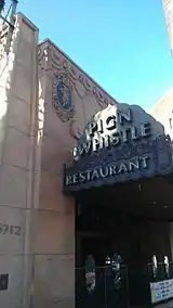 The Pig 'n Whistle was originally a chain of restaurants and candy shops, founded by John Gage in 1908.[4]:7 He opened his first location in Downtown Los Angeles, next to the now-demolished 1888 City Hall at 224 S. Broadway.[5][4]:7 Restaurateur Sidney Hoedemaker joined the company in 1927 and led expansion efforts throughout Southern California.[6] Hoedemaker purchased a downtown Los Angeles restaurant called Neve's Melody Lane in 1927 and adopted the name "Melody Lane" for new locations through the 1930s and 40s[7] Hoedemaker left Pig 'n Whistle in 1949 and started a chain of Hody's restaurants aimed at the young families moving into the Post WWII suburbs.[8] The Hollywood location of the Pig 'n Whistle was first opened in 1927[4] next to The Egyptian Theatre.[9] The building housing the new restaurant cost $225,000 and featured "[c]arved oak rafters, imported tiles, artistically wrought grilles and balcony and great panelled fresco paintings from Don Quixote."[9] It was frequented by such celebrities as Spencer Tracy, Shirley Temple and Howard Hughes.[10] The original Hollywood location closed down after World War II[11] and its distinctive wooden furniture, decorated with hand-carved whistle-playing pigs,[11] was sold to Miceli's Italian Restaurant, located around the corner at 1646 Las Palmas Avenue, where it remains to the present day.[12]