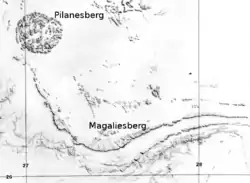 The area is defined by alternating ridges and valleys forming concentric rings, a geological formation that rises abruptly from the surrounding plains. The Pilanesberg is named for chief Pilane[1] of the Kgafêla people, who ruled from Bogopane, Mmamodimokwana and eventually Mmasebudule during the 1800s.[2] The 'Pilanesberg Alkaline Ring Complex' is the park's primary geological feature. This vast circular feature is geologically ancient, being the crater of a long-extinct volcano – the result of eruptions some 1,200 million years ago. It is one of the largest volcanic complexes of its type in the world, the rare rock types and formations make it a unique geological feature, and a number of rare minerals occur in the park.