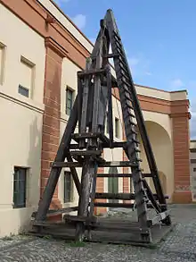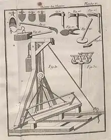There are a number of claims to the invention of the pile driver. A mechanically sound drawing of a pile driver appeared as early as 1475 in Francesco di Giorgio Martini's treatise Trattato di Architectura.[1] Also, several other prominent inventors — James Nasmyth (son of Alexander Nasmyth), who invented a steam-powered pile driver in 1845,[2] watchmaker James Valoué,[3] Count Giovan Battista Gazzola,[4] and Leonardo da Vinci[5] — have all been credited with inventing the device. However, there is evidence that a comparable device was used in the construction of Crannogs at Oakbank and Loch Tay in Scotland as early as 5000 years ago.[6] In 1801 John Rennie came up with a steam piledriver in Britain.[7] Otis Tufts is credited with inventing the steam pile driver in the United States.[8]