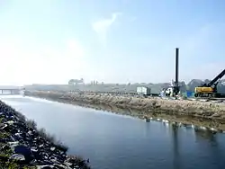 The underwater sound pressure caused by pile-driving may be deleterious to nearby fish.[9][10] State and local regulatory agencies manage environment issues associated with pile-driving.[11] Noise limit is 160 dB SEL at 750 m (820.21 yd). Mitigation methods include bubble curtains, balloons, internal combustion water hammers etc.[12]