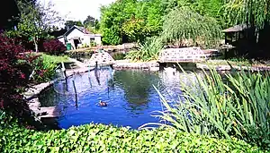 In the 1880s, a member of the Denny family built a house on North 90th Street and Densmore Avenue North in Seattle. James and Marietta Pilling purchased the property in 1909, and converted it to a dairy farm.[1] In 1924, their twelve-year-old son Charles A. Pilling (October 6, 1911 – October 24, 2001) dug a small pond to care for three injured mallard ducks he had been given.[2] This began Pilling's lifelong interest in breeding waterfowl. Over the years, the size of the pond was expanded to 100 by 50 feet (30 m × 15 m) on the half-acre lot. It was fed fresh water by diverting Licton Springs. It is bordered by bamboo stands, and yet with a viewing area on North 90th Street, it still remains part of Seattle's urban landscape. In the 1950s Pilling created a manually operated flood control system that was still in use in 2011.[3]