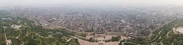The city walls of Pingyao were constructed in 1370,[2] the 3rd year of the Hongwu Emperor of the Ming. They enclose an area of about 2.25 km2 (0.87 sq mi).[2] The town is accessed by six barbican gates, one each on the north and south walls and two each on the east and west walls. This pattern is similar to that of a turtle (the head, tail and four legs), earning Pingyao the moniker "Turtle City." The walls measure about 12 m (39 ft) high, with a perimeter of 6,163 m (20,220 ft). A 4 m wide and 4 m (13 ft) deep moat can be found just outside the walls. Aside from the four structured towers at the four corners, there are also 72 watchtowers and more than 3,000 battlements. The number of defensive works supposedly represents the number of Confucius's disciples and other students.[3] The walls are considered among the best-preserved ancient city walls on this scale.