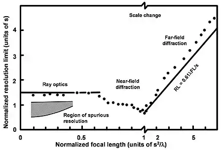 To the left, the pinhole is large, and geometric optics applies; the resolution limit is about 1.5 times the radius of the pinhole. (Spurious resolution is also seen in the geometric-optics limit.) To the right, the pinhole is small, and Fraunhofer diffraction applies; the resolution limit is given by the far-field diffraction formula shown in the graph and now increases as the pinhole is made smaller. In the region of near-field diffraction (or Fresnel diffraction), the pinhole focuses the light slightly, and the resolution limit is minimized when the focal length f (the distance between the pinhole and the film plane) is given by f = s2/λ. At this focal length, the pinhole focuses the light slightly, and the resolution limit is about 2/3 of the radius of the pinhole. The pinhole, in this case, is equivalent to a Fresnel zone plate with a single zone. The value s2/λ is in a sense the natural focal length of the pinhole.