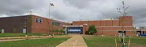 Land for a new, larger building was purchased from the University of Michigan in 1950. The new site, on West Stadium Blvd west of South Main Street, is directly southwest of the University of Michigan Football Stadium and had been used for game day parking, a tradition that continues under school district ownership. Construction of the new Ann Arbor High School building started in 1953 and was completed in time for all classes to move the new location for the fall of 1956.[4][6] By the 1960s, the new building had already reached capacity, and thus the school board established Huron High School on the city's east side as the city's second comprehensive high school. The old school was renamed to Pioneer High School starting in 1968.[7] Huron began operating as a separate school during the 1968-69 school year, before Huron's building was completed, so students from the old and new schools shared the Pioneer building that year on a split schedule with Pioneer students attending classes in the morning and Huron students in the afternoon.