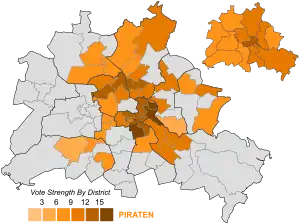 In the 2011 Berlin state election, with 8.9% of the votes[28] the Pirate Party of Berlin managed for the first time to overcome the 5% threshold and to win seats (numbering 15 out of 141 seats in the Abgeordnetenhaus) in a German state parliament.[29] This was quite a surprise for them, since they only had 15 candidates on the ballot. In response to their election, however, Mayor Klaus Wowereit criticized their lack of diversity, most notably the lack of women in the party.[30]