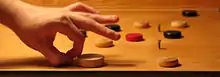Pitchnut is a wooden tabletop game of French Canadian origins, similar to carrom, crokinole and pichenotte, with mechanics that lie somewhere between pocket billiards and air hockey.[1] Unlike with pichenotte and carrom, there are no records of pitchnut being mass-produced; all existing boards are handmade. Pitchnut is not a patented game. It is in the public domain. Many modern boards are in use, made mostly by Lee Larcheveque, and before him, by Achille Scalabrini, in Sainte-Edwidge-de-Clifton, Quebec, Canada. Pitchnut is a registered trademark of Lee Larcheveque. The game is common on the farming villages near Coaticook, Quebec, Canada and in Amherst, Massachusetts, United States. The name is likely an Anglicized form of the French word pichenotte, meaning 'flick'.