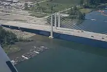 The Pitt River Bridge and Mary Hill Interchange Project included a new seven-lane bridge that replaced the existing swing bridges, as well as an interchange to replace the current Lougheed Highway and Mary Hill Bypass intersection.[29] Golden Ears Bridge, which connects Pitt Meadows and Maple Ridge to Surrey and Langley, opened in 2009. Golden Ears is the name of the summit that lies north of Pitt Meadows. In 2011, Lougheed Highway upgrades included the widening and extension of the westbound HOV lane between the Golden Ears Bridge and Harris Road, the addition of bus queue jump lanes in both directions, at the Kennedy Road intersection leading to and from the Pitt River Bridge.[30] The Golden Ears Bridge, completed in summer of 2009, connects Pitt Meadows and Maple Ridge with the communities of Langley and Surrey south across the Fraser River. Construction of the new Pitt River Bridge, connecting Pitt Meadows with Port Coquitlam to the west, was completed in autumn 2009.[2]