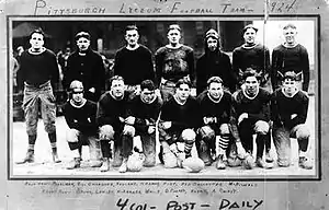 The Pittsburgh Lyceum were a professional football team based in Pittsburgh, Pennsylvania from 1906[1] until 1910. The team played against many of the top "Ohio League", the most notables being the Canton Bulldogs and the Massillon Tigers.[2] They were regarded as one of the top professional football teams in Pittsburgh from 1907 until the mid-1920s. The Lyceum was also the last pro football championship team Pittsburgh would produce until the 1970s. Many of their victories came against many of the strongest teams in Pennsylvania, West Virginia, and Ohio. Hence, they were given the mythical moniker the "Tri-State Champions" in 1909. The team was finally defeated in 1909, via an upset by the Dayton Oakwoods in their final game of 1909. The Lyceums broke up after a disappointing 1910 season.[3] An unrelated incarnation of the team existed in 1924. Art Rooney, who would go on establish the Pittsburgh Steelers and become enshrined in the Pro Football Hall of Fame, played for the Lyceum.[4]