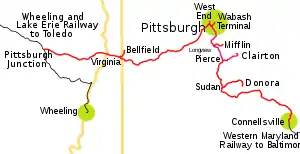 The Pittsburgh and West Virginia Railway (reporting mark PWV) was a railroad in the Pittsburgh, Pennsylvania and Wheeling, West Virginia, areas. Originally built as the Wabash Pittsburgh Terminal Railway, a Pittsburgh extension of George J. Gould's Wabash Railroad, the venture entered receivership in 1908 and the line was cut loose. An extension completed in 1931 connected it to the Western Maryland Railway at Connellsville, Pennsylvania, forming part of the Alphabet Route, a coalition of independent lines between the Northeastern United States and the Midwest. It was leased by the Norfolk and Western Railway in 1964 in conjunction with the N&W acquiring several other sections of the former Alphabet Route, but was leased to the new spinoff Wheeling and Lake Erie Railway in 1990, just months before the N&W was merged into the Norfolk Southern Railway.