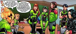 Pixie returns to the X-Men, but demonstrating noticeably improved fighting ability and greater anger when she hears about "Proposition X," a piece of anti-mutant legislation seeking to control mutant reproduction.[28] She continues to work with the X-Men, using her abilities to defeat enemies such as Empath and rescue several students and team members, such as when the Sisterhood, a team of mutant villainesses led by a revived Madelyne Pryor, attack the X-Men's headquarters.[29] During the protests between anti-mutant and pro-mutant movements about mutant reproductive rights, Pixie is injured when a riot breaks out.[30] Later she teleports Rogue, Gambit and Danger to San Francisco for assistance.[31] She is later made a part of a team to battle Emma Frost's Dark X-Men.[32] After Emma Frost, Namor and Cloak and Dagger betray the Dark X-Men and Norman Osborn and relocate to Utopia, Pixie and Magik begin teleporting everyone to their new island base.[33] During the final battle, Pixie joins Armor and X-23 in fighting Daken.[34]
